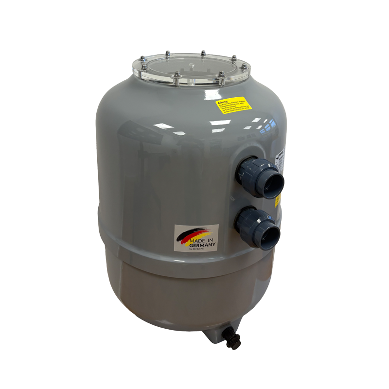 Sandfilteret Mediterranean i sprøytestøpt polypropylen finnes i tre størrelser og kan fås med både toppmontert og sidemontert ventil. Et sandfilter med toppmontert ventil tar ofte litt mindre plass i teknisk rom. Det er også noe enklere å installere. Fordelen med en sidemontert ventil er at du kan se